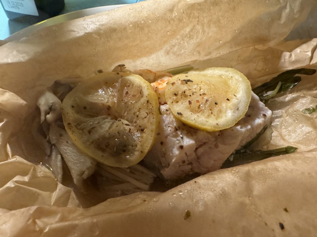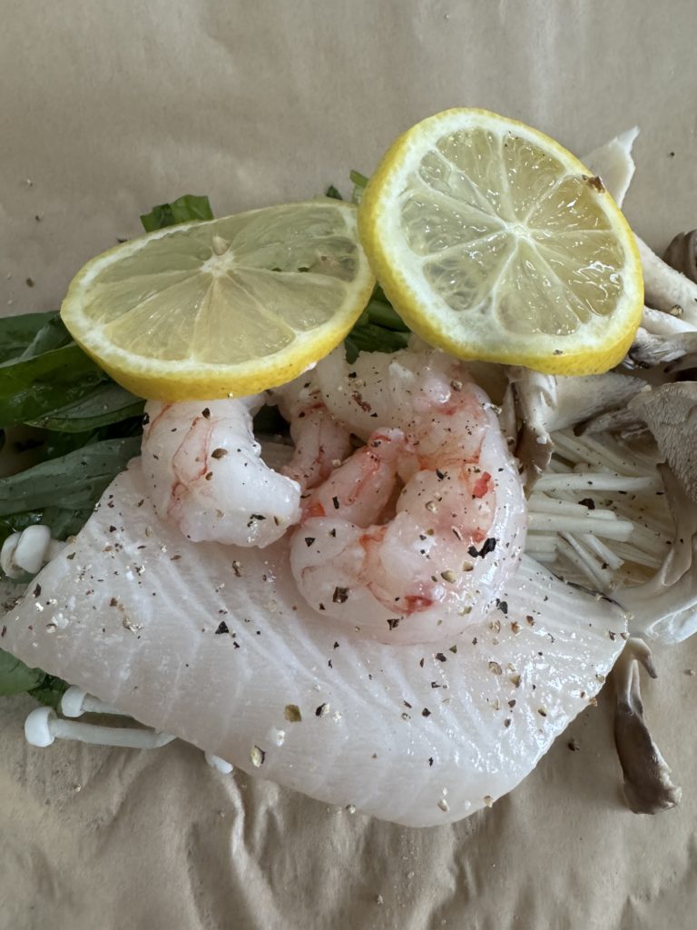 - 銀鱈の紙包み蒸し(エビ、空芯菜、エノキ、舞茸入り)