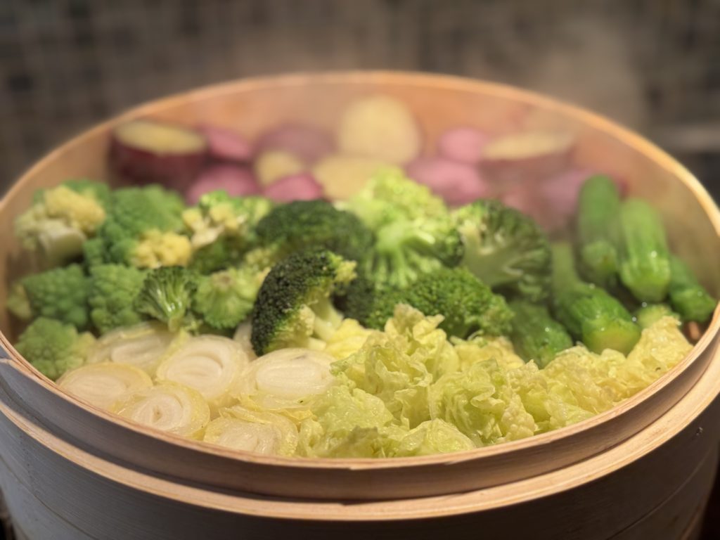 蒸し野菜や紙包み蒸しは、それぞれの好みや制限に合わせてソースを選べるように。